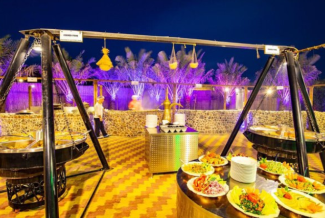 Our beautifully crafted Bedouin-style camp creates the perfect environment for relaxation, energy, and entertainment. Enjoy a reinvented selection of classic Arabic dishes, live BBQ cooking, and a comfortable reserved dining area. As the night sets in, you’ll be captivated by our talented performers, including a mesmerizing belly dancer, dynamic Tanura artist, and more cultural entertainment.